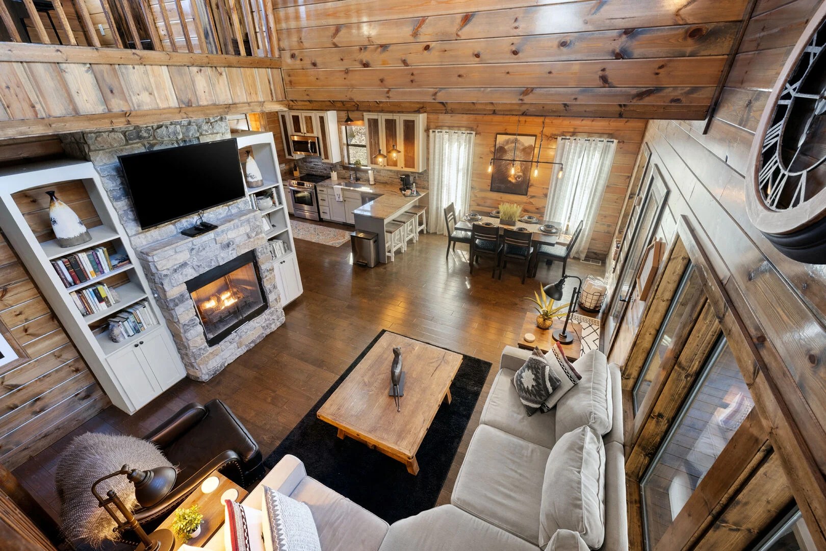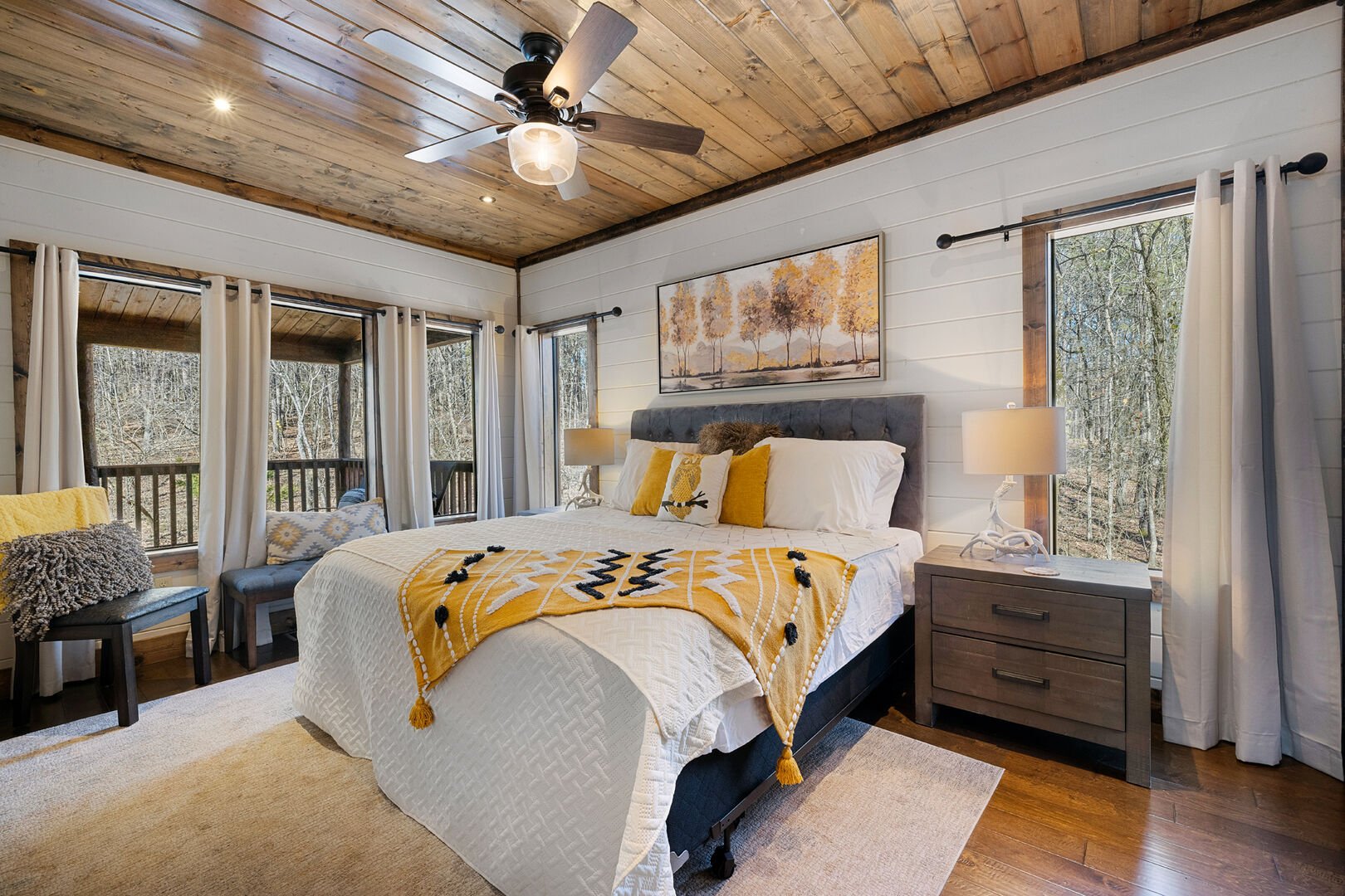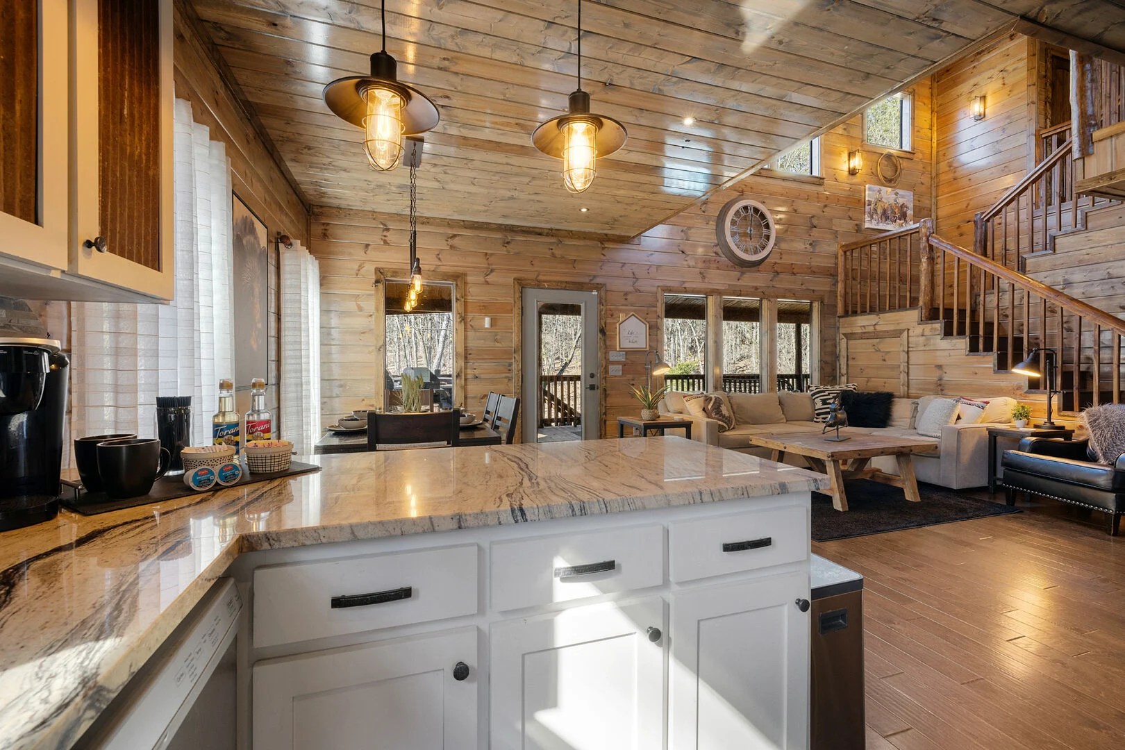Backing up to the surrounding National Forest, SkyHorse Lodge provides a scenic and secluded getaway all while being within walking distance of downtown Hochatown. Take in the stunning views from the expansive rear patio, relaxing hot tub, private screened master porch or through many of the large windows in the cabin.