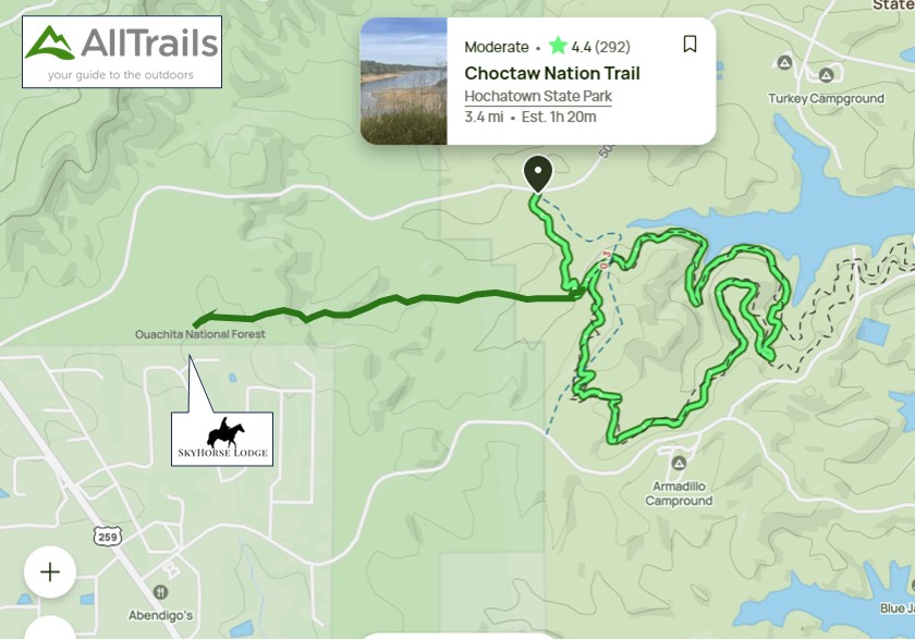 BEAVERS BEND STATE PARK, MARINA & PUBLIC BOAT RAMPS: Highway 259 can get congested, and one of the things we love most about SkyHorse Lodge is the ability to have multiple access points to get to the lake amenities without getting onto 259. There is a back access directly to Stevens Gap Road which leads to all things “Lake”.